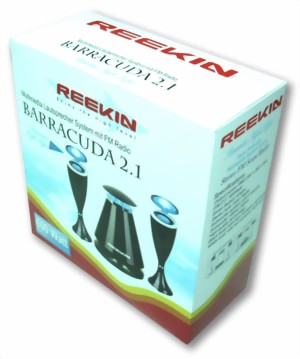 2.1 Multimedia Lautsprecher-System mit eingebautem FM-Radio, Subwoofer und Nacht-Beleuchtung. Durch das mitgelieferte Netzteil ist es sowohl ohne Computer nutzbar (z.B. in der Küche, Bad, Garage, Hobbyraum) als auch natürlich als Computer oder Notebook-Lautsprecher.