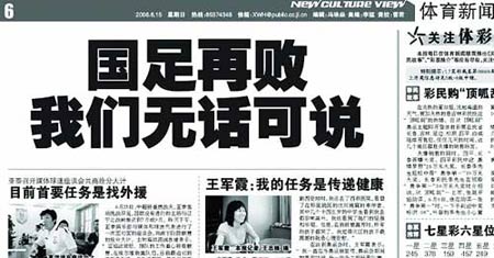 6月14日中国队在天津1:2输给了伊拉克队小组赛提前被淘汰,再次彻底无缘南非世界杯。15日全国各大媒体对此事均予以报道,记者注意到长春《新文化报》第6版上,读者只能看到用84磅超粗黑体字做的一个大标题:《国足再败我们无话可说》。只有标题,没有具体稿件。