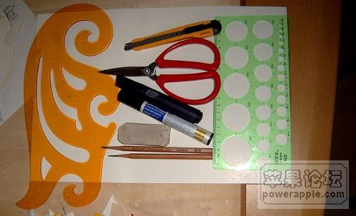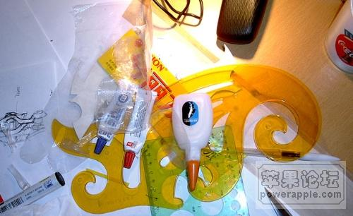 工具合影,这次准备纯手工,回到尺规时代。圆规基本属于上世纪的古董了,只剩下一条腿,我毫不犹豫得把它请进了纸娄。可惜丁字尺找不到了,要不还能看起来专业点。