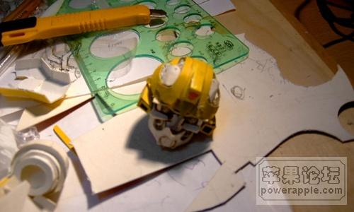 材料基本齐备。先得搜索资料,勾勾草图,有助于对形体结构的理解。这个过程可是重中之重。我参考的图片都是网上的,基本都是正面,背面的只找到一张,而且非常模糊,没办法,猜吧。(后来找到了比较清晰的背面图片,发现有些地方做错了,可惜已经整合了,修改了一部分,其余的只有错下去了)对电影版的大黄蜂进行了仔细的研究,发现变形的过程极其复杂,而且有很多地方发生了形变,于是放弃了能变形的想法,把精力投入到可动性方面吧。